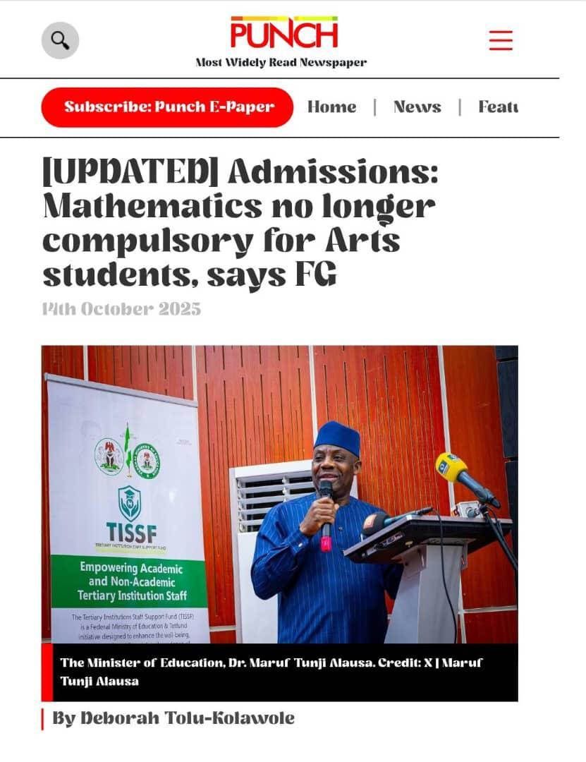 FEDERAL GOVERNMENT DROPS MATHEMATICS REQUIREMENT FOR ARTS, HUMANITIES UNIVERSITY ADMISSIONS ​The Federal Ministry of Education (FME) has announced that a credit pass in Mathematics (WAEC/NECO) is no longer mandatory for Nigerian students applying to Arts and Humanities courses in universities and polytechnics. ​This reform ends a long-standing requirement for all admission seekers. The updated National Guidelines aim to streamline the admission process and expand access to higher education. Universities will still require a minimum of five credit passes in relevant subjects, including English Language, in no more than two sittings. ​Mathematics remains compulsory for admission into all Science, Technology, and Social Science courses in universities and polytechnics (for science-related programnes). ​Education Minister, Dr. Tunji Alausa, stated the reform is a deliberate effort to tackle the persistent gap between applicants and admitted students, which he blamed on "outdated and overly stringent entry requirements." The FME projects the new policy will increase annual admissions from about 700,000 to one million students, creating opportunities for an additional 250,000 to 300,000 students yearly. ​So far, the reform has been praised by education analyst Ayodamola Oluwatoyin as a "brilliant reform" that will "improve the ease of admissions." The FME confirms the revised guidelines are designed to remove barriers while maintaining academic standards.