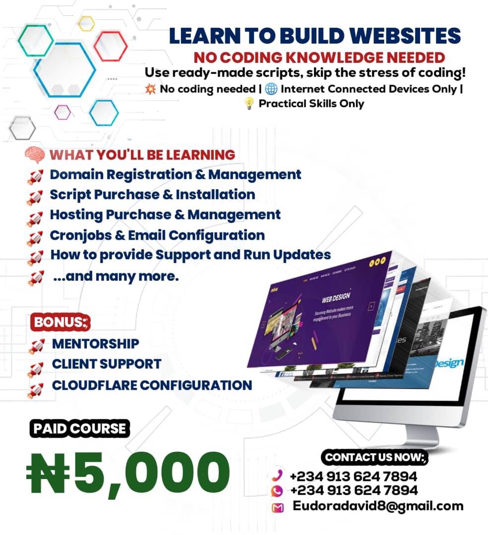 This comprehensive course empowers you to build professional websites using ready-made scripts and practical implementation strategies. Perfect for entrepreneurs, freelancers, and aspiring web professionals who want to deliver quality websites without the complexity of traditional coding.