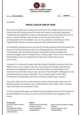 The Students’ Union of Obafemi Awolowo University (Great Ife) has announced the unfortunate death of a Dentistry student, even as efforts persist to locate another missing student, Dorcas Oseghale.