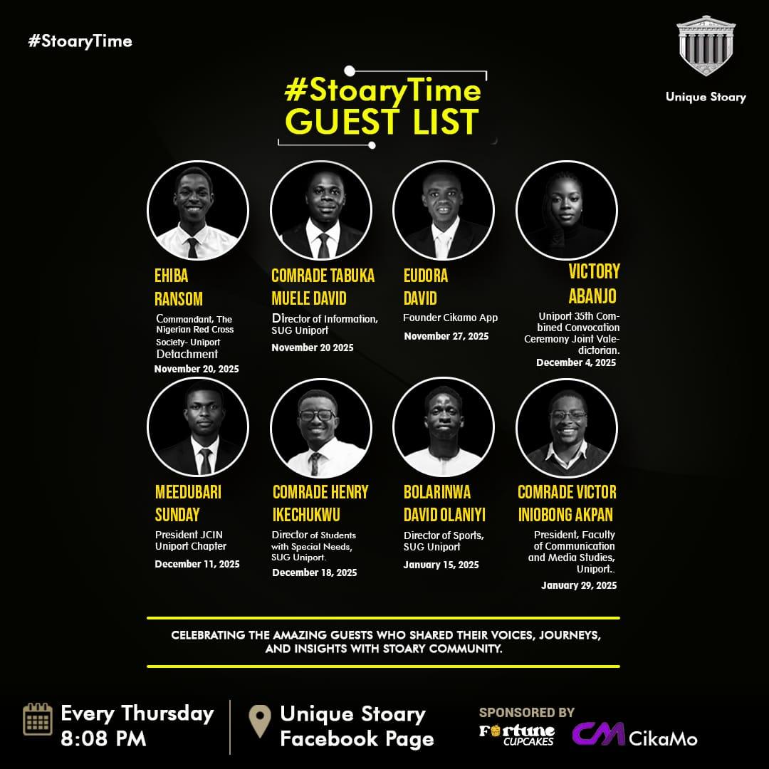 #UniqueStoary #Uniport #Stoary #StoaryTime #ABetterUniport #Cikamo #Campus cikamo Admin #CampusGist #CampusLife🎙️ TO OUR INCREDIBLE STOARY TIME GUESTS — THANK YOU Every episode of #StoaryTime has been shaped by the voices that showed up, spoke honestly, and shared their journeys. To every guest featured on this flyer—thank you for trusting the space, lending your voice, and helping us create conversations that truly matter. You didn’t just join a live show. You helped build a community, spark ideas, and remind us that every Stoary carries purpose. #StoaryTime Guest List • Ehiba Ransom Commandant, The Nigerian Red Cross Society - Uniport Detachment November 20, 2025 • Comrade Tabuka Muele David Director of Information, SUG Uniport November 20, 2025 • Eudora David Founder Cikamo App November 27, 2025 • Victory Abanjo Uniport 35th Combined Convocation Ceremony Joint Valedictorian. December 4, 2025 • Meedubari Sunday President JCIN Uniport Chapter December 11, 2025 • Comrade Henry Ikechukwu Director of Students with Special Needs, SUG Uniport December 18, 2025 • Bolarinwa David Olaniyi Director of Sports, SUG Uniport January 15, 2026 • Comrade Victor Iniobong Akpan President, Faculty of Communication and Media Studies, Uniport. January 29, 2026 We celebrate you. We appreciate you. And we’re grateful to have shared this journey together. Here’s to more impact, more connection, and many more Stoaries worth telling. _____________________________________________ We have a WhatsApp channel. Do well to follow for exclusive offers, placements and real time updates; https://whatsapp.com/channel/0029VbAYOmR05MUbjMcimM00 _____________________________________________ #UniqueStoary #Uniport #Stoary #StoaryTime #ABetterUniport #Cikamo #Campus [cikamoAdmin] #CampusGist #CampusLife· 0 Commenti ·0 condivisioni ·250 Views ·0 Anteprima2