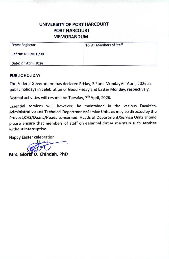 #UniqueStoary #Uniport #Stoary #ABetterUniport #Campus #CampusGist #CampusLifeUNIVERSITY OF PORT HARCOURT MEMORANDUM From: Registrar To: All Members of Staff Ref No: UPH/REG/30 Date: 2nd April, 2026 PUBLIC HOLIDAY The Federal Government has declared Friday, 3rd and Monday 6th April, 2026 as public holidays in celebration of Good Friday and Easter Monday, respectively. Normal activities will resume on Tuesday, 7th April, 2026. Essential services will, however, be maintained in the various Faculties, Administrative and Technical Departments/Service Units as may be directed by the Provost, CHS/Deans/Heads concerned. Heads of Department/Service Units should please ensure that members of staff on essential duties maintain such services without interruption. Happy Easter celebration. Signed ✍️ Mrs. Gloria O. Chindah, PhD 📌 Join the Unique Stoary Community on Telegram let's have real time discussions on latest happenings and matters arising. Click on this link to join https://t.me/uniquestoary _____________________________________________ We have a WhatsApp channel. Do well to follow for exclusive offers, placements and real time updates; https://whatsapp.com/channel/0029VbAYOmR05MUbjMcimM00 _____________________________________________ #UniqueStoary #Uniport #Stoary #ABetterUniport #Campus #CampusGist #CampusLife· 0 Commenti ·0 condivisioni ·5 Views ·0 Anteprima1