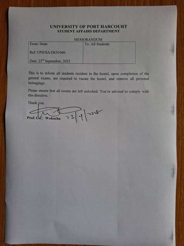#Hostel_Updates📢📢📢📢📢📢📢 Greetings Unique Student of Uniport This is to inform all Students residents in the hostel, upon completion of the general Examinations, are required to vacate the hostel and remove all personal belongings. Please ensure that all rooms are left unlocked. You're advised to comply with this directive. #UNPORT_INFO #Hostel_Updates0 Kommentare ·0 Geteilt ·1KB Ansichten ·0 Bewertungen -