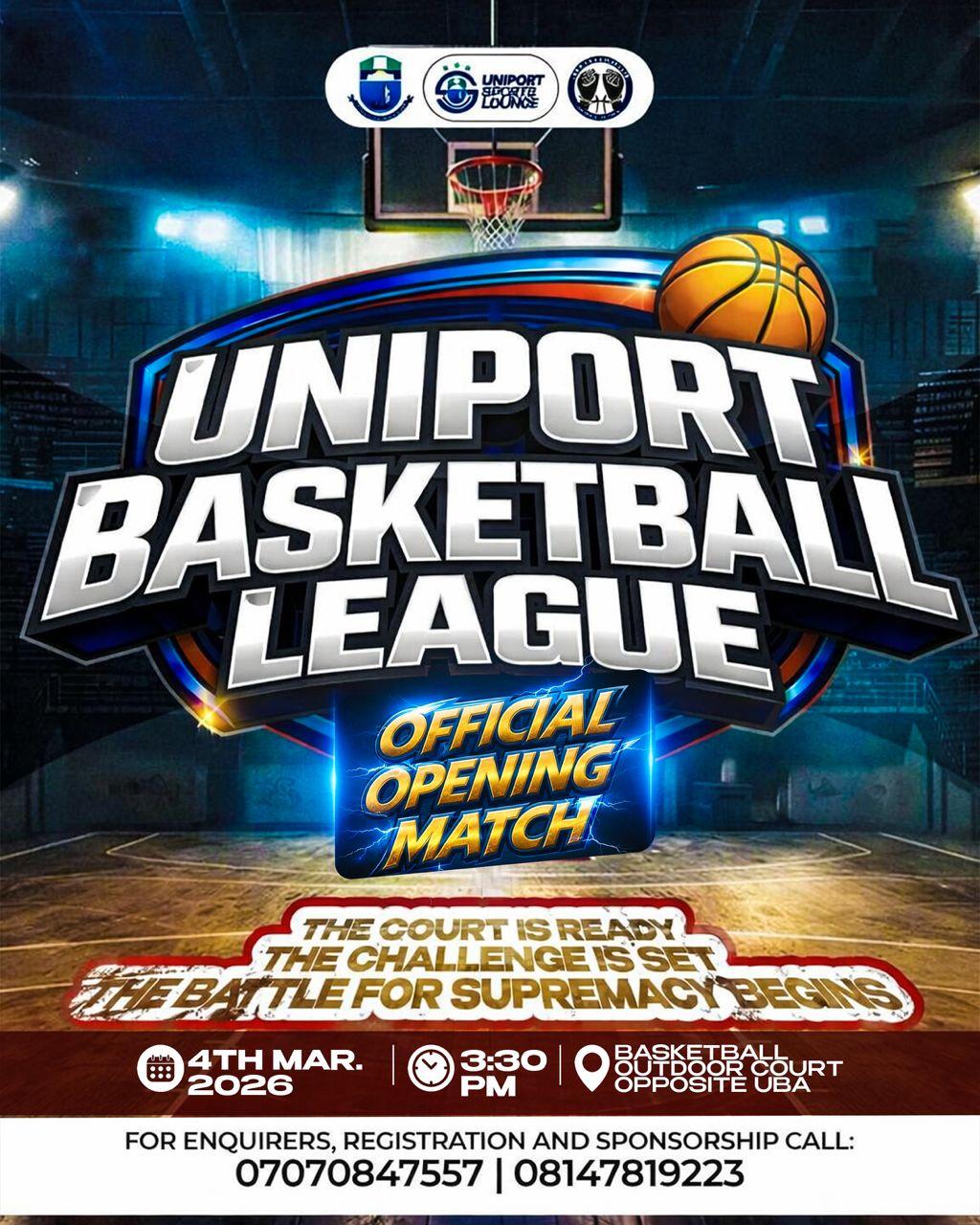 OFFICE OF THE DIRECTOR OF SPORTS STUDENTS' UNION GOVERNMENT UNIVERSITY OF PORT HARCOURT PRESS RELEASE UNIPORT Basketball League 2026 Official Opening Match Holds Today The Office of the SUG Director of Sports is pleased to announce that the official opening match of the UNIPORT Basketball League 2026 takes place today. Date: Wednesday, 4th March 2026 Time: 3:30 PM Venue: Basketball Outdoor Court (Opposite UBA) Following weeks of anticipation, the battle for supremacy officially begins this afternoon as competing teams clash on the court. All students, sports lovers, and members of the university community are warmly invited to witness this exciting showcase of talent and school spirit. The court is ready. The challenge is set. The battle begins. For enquiries and sponsorship, contact: · 0707 084 7557 · 0814 781 9223 Signed: Isaiah Christopher Chief Press Secretary to the SUG Director of Sports Comrade Bolarinwa David (Holla) SUG Director of Sports _____________________________________________ We have a WhatsApp channel. Do well to follow for exclusive offers, placements and real time updates; https://whatsapp.com/channel/0029VbAYOmR05MUbjMcimM00 _____________________________________________ #UniqueStoary #Uniport #Stoary #UniportSUG #SUGUniport #UniportSports #UniportBaskeballLeague #Basketball #Sports #ABetterUniport #Cikamo #Campus #CampusGist #CampusLife