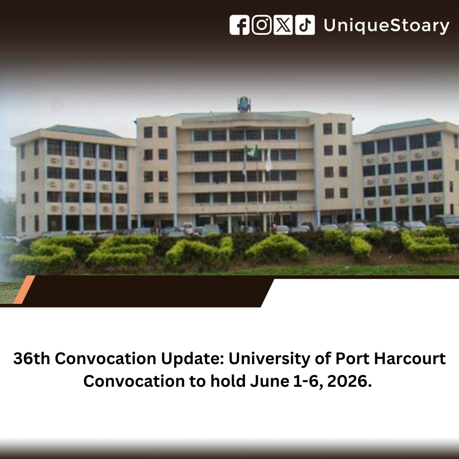 Uniport Convocation Update.The University of Port Harcourt has announced new dates for its 36th Convocation Ceremony.🗓️ June 1–6, 2026All concerned are advised to take note of this change and prepare accordingly.📌 Join the Unique Stoary Community on Telegram let's have real time discussions on latest happenings and matters arising in Uniport. Click on this link to join https://t.me/uniquestoary_____________________________________________We have a WhatsApp channel. Do well to follow for exclusive offers, placements and real time updates;https://whatsapp.com/channel/0029VbAYOmR05MUbjMcimM00_____________________________________________#UniqueStoary #Uniport #Stoary #ABetterUniport #Campus #CampusGist #CampusLife