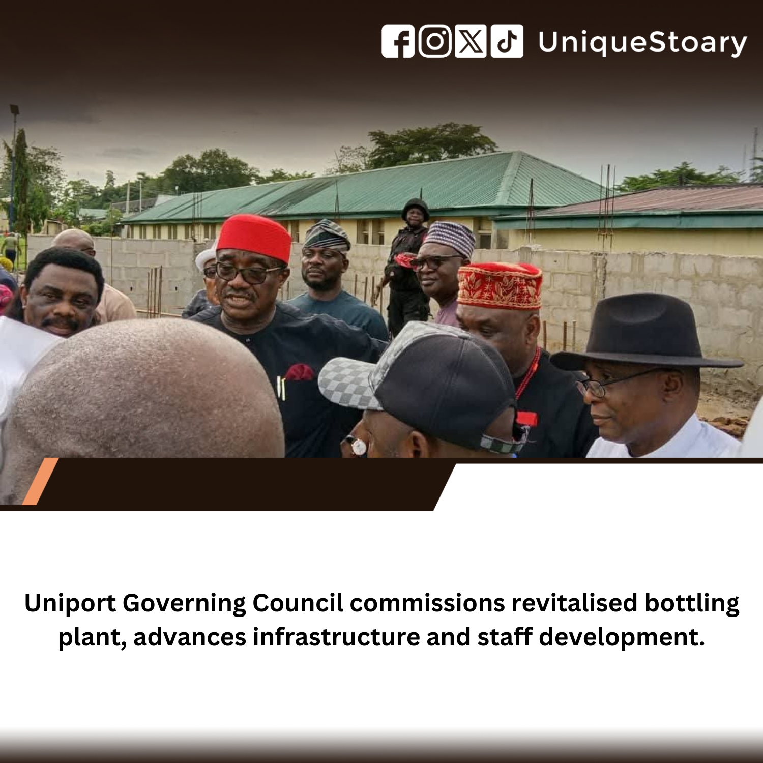 Uniport Governing Council Commissions Revitalised Bottling Plant, Advances Infrastructure and Staff Development. The Governing Council of University of Port Harcourt has commissioned the institution’s revitalised bottling plant, marking a significant stride in its drive for sustainability and institutional growth. The commissioning ceremony, held over the weekend, was led by the Chairman of Council, Senator Mao Ohuabunwa. The upgraded facility, now equipped with modern, state-of-the-art machinery, boasts an impressive production capacity of up to 8,000 bags per day. This development is expected to significantly boost the University’s internally generated revenue while enhancing overall operational efficiency. As part of its oversight functions, the Council also undertook an inspection of key infrastructure projects across the University. Among these was the Federal Government-backed solar farm project, designed to ensure uninterrupted power supply within the campus. Additionally, the Council reviewed progress on an ongoing hostel accommodation project under a Public-Private Partnership (PPP) arrangement aimed at addressing the growing housing needs of students. In a move that underscores its commitment to academic excellence and staff development, the Council approved the promotion of several academic staff to the ranks of Professor and Associate Professor. Furthermore, seven staff members were elevated to the rank of Directors, alongside the promotion of Deputy Registrars, as well as personnel within the Bursary, Audit, and other administrative cadres. Reaffirming the Council’s vision for the institution, Senator Ohuabunwa emphasized its commitment to positioning the University on the global stage. He noted that sustained investment in infrastructure, academic advancement, and innovation will not only strengthen the University’s standing but also establish it as a benchmark for excellence in higher education. With these developments, the University of Port Harcourt continues to demonstrate a clear focus on growth, resilience, and global competitiveness. 📌 Join the Unique Stoary Community on Telegram let's have real time discussions on latest happenings and matters arising in Uniport. Click on this link to join https://t.me/uniquestoary _____________________________________________ We have a WhatsApp channel. Do well to follow for exclusive offers, placements and real time updates; https://whatsapp.com/channel/0029VbAYOmR05MUbjMcimM00 _____________________________________________ #UniqueStoary #Uniport #Stoary #ABetterUniport #Campus #CampusGist #CampusLife