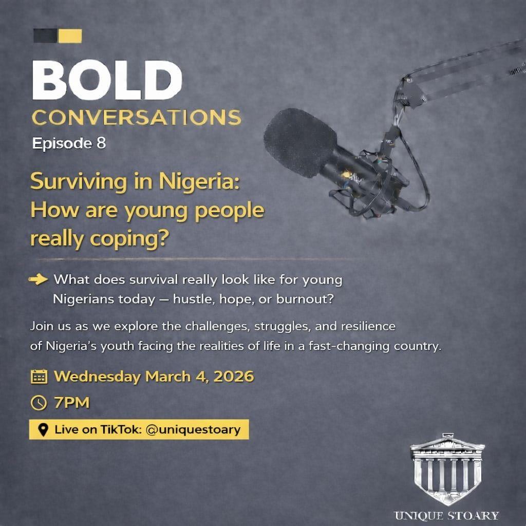 🎙️ BOLD Conversations – Episode 8 Topic: Surviving in Nigeria: How are young people really coping? Living in Nigeria today as a young person means learning how to survive pressure, uncertainty, and rising expectations — all at once. From financial struggles to emotional stress, from dreams to daily hustles, many young people are quietly carrying heavy loads. But how are we really coping? Are we thriving… or just surviving? This episode opens up a bold and honest conversation about the realities young Nigerians face — the challenges, the resilience, and the silent battles behind the smiles. What does survival truly look like for young Nigerians today — hustle, hope, or burnout? How do we stay mentally strong in a system that constantly tests us? What conversations about youth struggles are we avoiding? Tune in LIVE as we create space for truth, reflection, and meaningful dialogue. 🗓 Wednesday, March 4, 2026 | 7PM 📍 Live on TikTok: https://www.tiktok.com/@uniquestoary Today’s eighth episode of BOLD Conversations is about understanding the real lives of Nigerian youth and finding strength in shared stories. See you by 7PM. Let’s make it BOLD. BOLD Conversations — where minds are sharpened, perspectives are stretched, and clarity begins with courage. _____________________________________________ We have a WhatsApp channel. Do well to follow for exclusive offers, placements and real time updates; https://whatsapp.com/channel/0029VbAYOmR05MUbjMcimM00 _____________________________________________ #UniqueStoary #Uniport #Stoary #BoldConversations #ABetterUniport #StudentStories #Campus #CampusGist #CampusLife