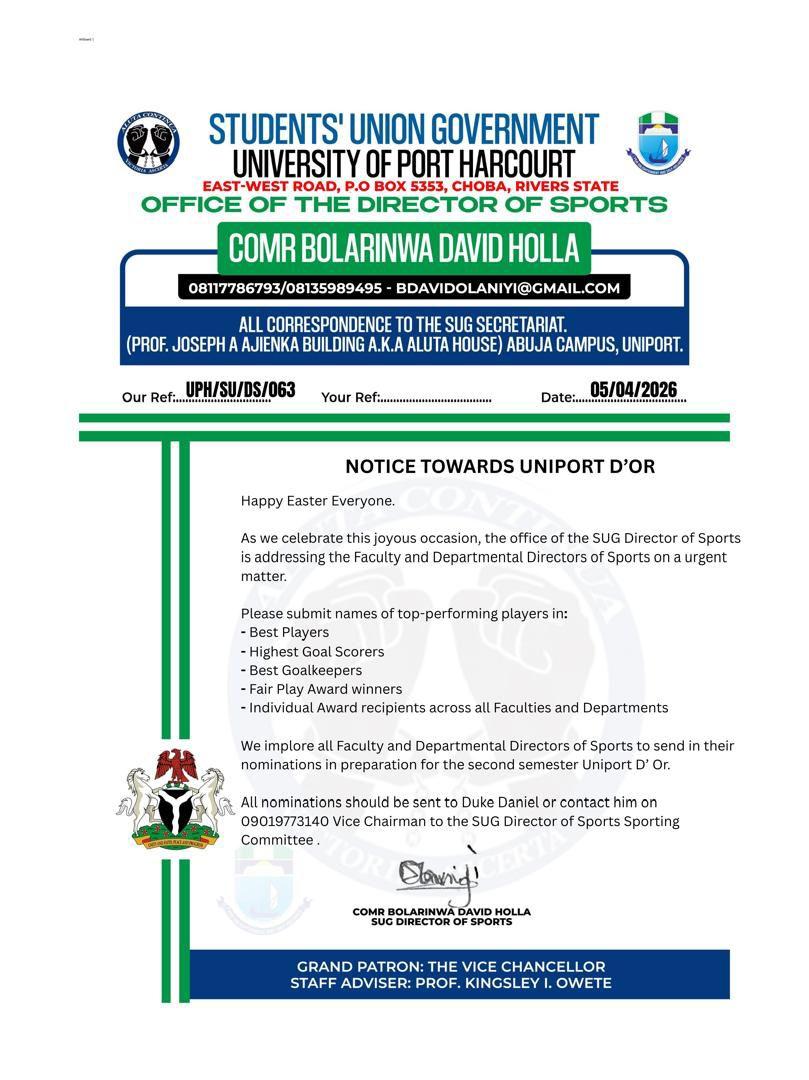NOTICE TOWARDS UNIPORT D’OR Happy Easter Everyone. As we celebrate this joyous occasion, the office of the SUG Director of Sports is addressing the Faculty and Departmental Directors of Sports on an urgent matter. Please submit names of top-performing players in: * Best Players * Highest Goal Scorers * Best Goalkeepers * Fair Play Award winners * Individual Award recipients across all Faculties and Departments We implore all Faculty and Departmental Directors of Sports to send in their nominations in preparation for the second semester Uniport D’or. All nominations should be sent to Duke Daniel or contact him on 09019773140 Vice Chairman to the SUG Director of Sports Sporting Committee. Signed ✍️ Comr. Bolarinwa David Holla SUG Director of Sports 📌 Join the Unique Stoary Community on Telegram let's have real time discussions on latest happenings and matters arising in Uniport. Click on this link to join https://t.me/uniquestoary _____________________________________________ We have a WhatsApp channel. Do well to follow for exclusive offers, placements and real time updates; https://whatsapp.com/channel/0029VbAYOmR05MUbjMcimM00 _____________________________________________ #UniqueStoary #Uniport #Stoary #SUGUniport #UniportSUG #SUG #UniportSports #ABetterUniport #Campus #CampusGist #CampusLife