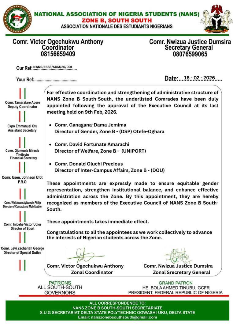 Yet another big congratulation to the 10th senate and to Distinguished Senator: David Amarachi Fortunate (Secretary in-house committee on Ethics, Peace and Discipline) as the director of welfare NANS-South South zone B Congratulations likewise to: 1) SEN: James oveta E. 2) SEN: Apapa Mimontu 3) SEN: Obed Onyeso Obioma. On their various appointments in NANs south south zone B (under the office of the deputy coordinator respectively. Signed: SEN: DESMOND AYEBAYE BESTMAN ILEGIMOKUMA (Senate President of the 10th Senate) _____________________________________________ We have a WhatsApp channel. Do well to follow for exclusive offers, placements and real time updates; https://whatsapp.com/channel/0029VbAYOmR05MUbjMcimM00 _____________________________________________ #UniqueStoary #Uniport #Stoary #SUGUniport #UniportSUG #SUG #ABetterUniport #Cikamo #Campus #CampusGist #CampusLife