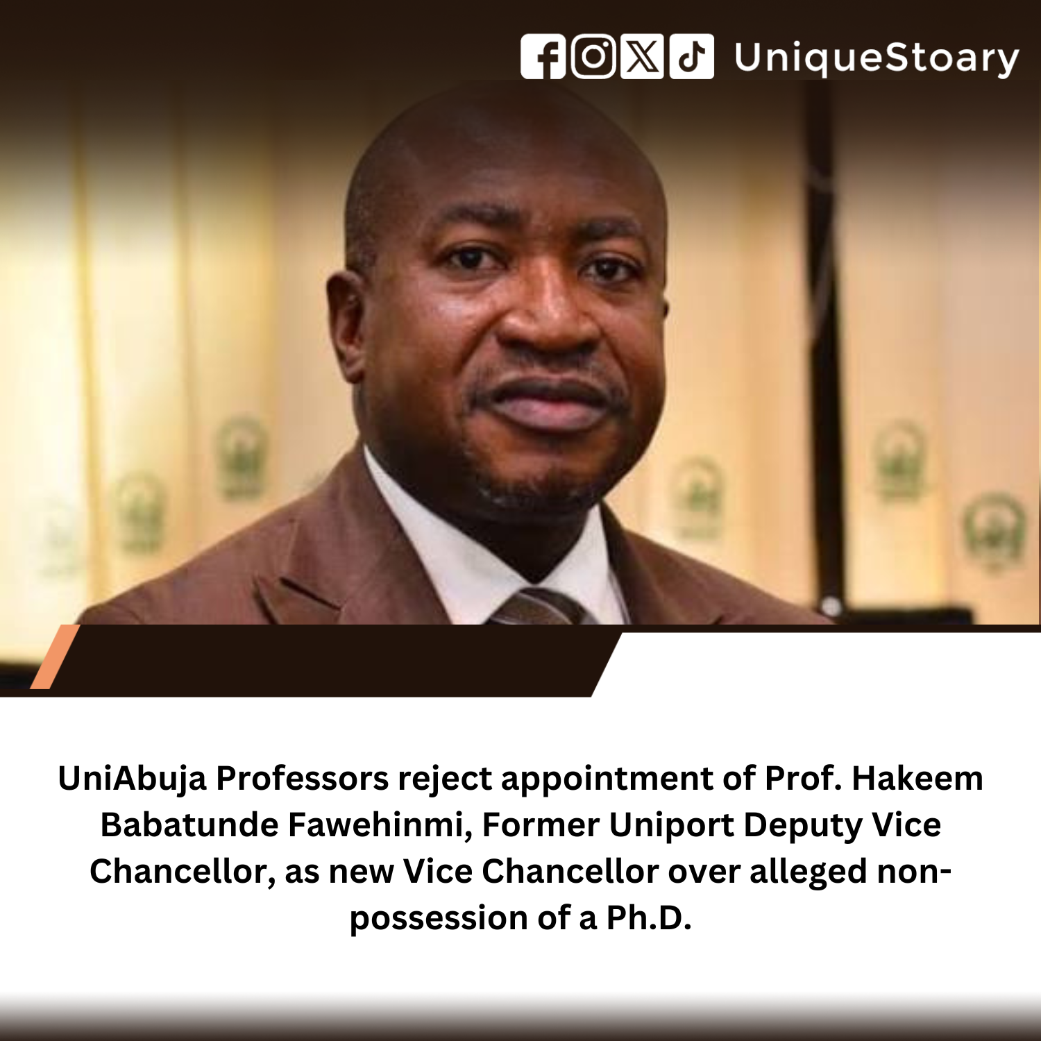 UniAbuja Professors Reject Appointment of Prof. Hakeem Babatunde Fawehinmi, Former Uniport Deputy Vice Chancellor, as New Vice Chancellor Over Alleged Non-Possession of a Ph.D. Fresh controversy has erupted at the University of Abuja following the appointment of Professor Hakeem Babatunde Fawehinmi — former Deputy Vice Chancellor (Academic) of the University of Port Harcourt — as the institution’s new Vice Chancellor. The appointment was approved by the 11th Governing Council of the University, chaired by Distinguished Senator Dr. Olanrewaju Tejuoso, and was announced during its 80th Extraordinary Meeting held on Friday, 7th November 2025. Prof. Fawehinmi is scheduled to assume office on 10th February 2026 for a non-renewable five-year tenure. Unique Stoary had earlier congratulated Prof. Fawehinmi on his appointment on November 11, 2025, highlighting his academic leadership and experience. However, barely a month after the announcement, a coalition of academic staff under the banner of the Concerned Academic Stakeholders of the University of Abuja formally rejected the appointment, alleging that Prof. Fawehinmi does not possess a Ph.D., which they insist was a mandatory requirement clearly stated in the advertised criteria for the Vice Chancellorship. According to the protesting academics, the job advertisement explicitly required candidates to hold a doctoral degree, reflecting long-established norms of the National Universities Commission (NUC). While Prof. Fawehinmi is widely respected for his academic leadership, distinguished scholarship, and professional fellowships, the group argues that fellowships cannot substitute for a Ph.D. when assessing eligibility for the office of Vice Chancellor. They warn that proceeding with the appointment despite this alleged breach could create legal, procedural, and governance challenges for the institution. The stakeholders are urging the Governing Council to review the appointment or consider the next fully qualified candidate on the shortlist to safeguard the university’s credibility. As the tension builds, the academic community is closely following how the Council will respond to these concerns ahead of the February 2026 resumption date. Unique Stoary will continue to track this unfolding story and provide verified updates. _____________________________________________ We have a WhatsApp channel. Do well to follow for exclusive offers, placements and real time updates; https://whatsapp.com/channel/0029VbAYOmR05MUbjMcimM00 _____________________________________________ #UniqueStoary #Uniport #ABetterUniport #NUC #UniAbuja #UniportNews #Cikamo #Campus #CampusGist #CampusLife #CampusUpdate