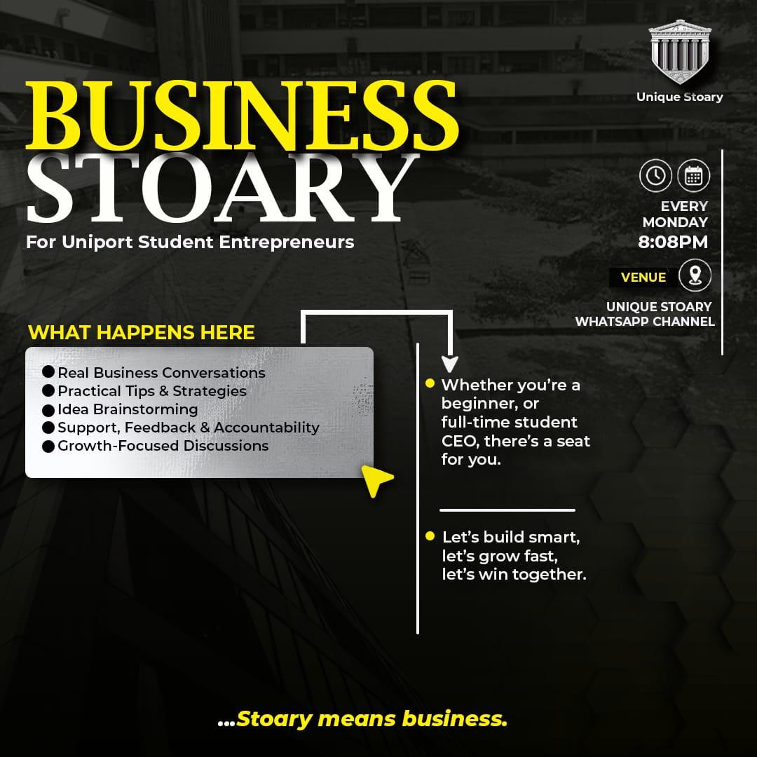 #UniqueStoary #BusinessStoary #Uniport #ABetterUniport #Entrepreneurship #Business #CampusLife #StoaryMeansBusiness #UniportEntrepreneurs #CampusBusiness #StudentFounders