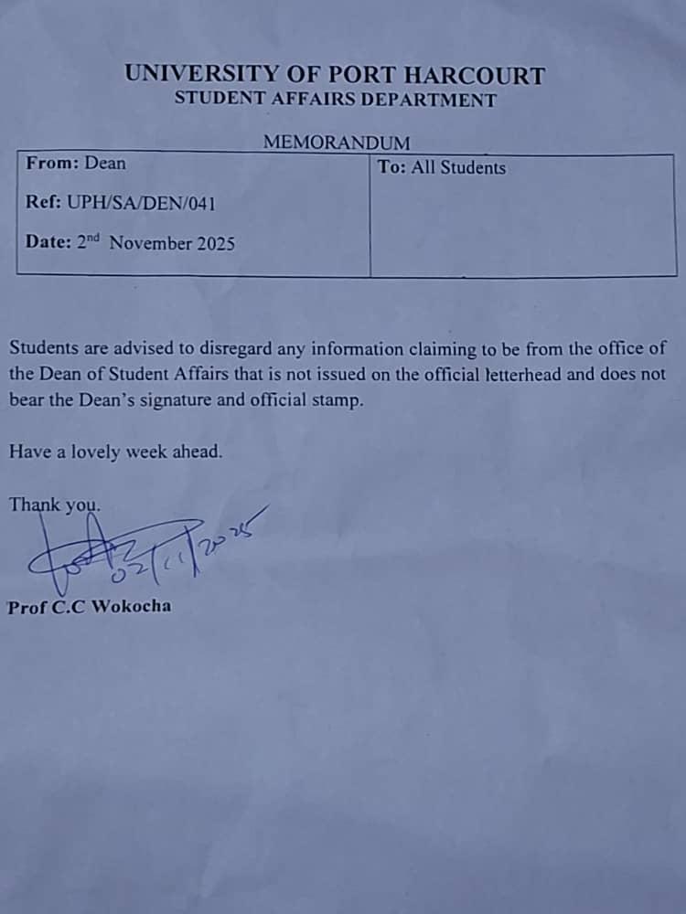 🔊🔊🔊🔊🔊 PUBLIC NOTICE Students are advised to disregard any information claiming to be from the office of the Dean of Students affairs, that is not issued on the official Letter head and does not bear the DSA's Signature and official Stamp. Thank you. Signed ✍️✍️ Dean of Students affairs Uniport Announcer COMR. TABUKA MUELE DAVID SUG Director of Information* University of Port Harcourt #UniportNews