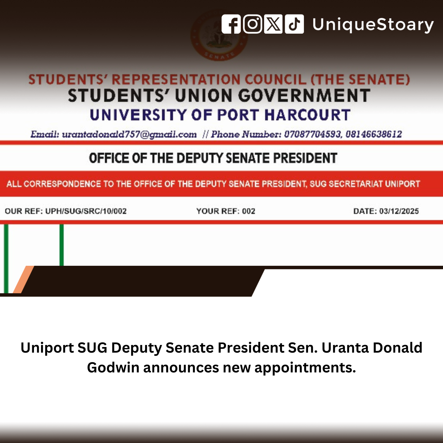 • Uniport SUG Deputy Senate President Sen. Uranta Donald Godwin Announces New Appointments.