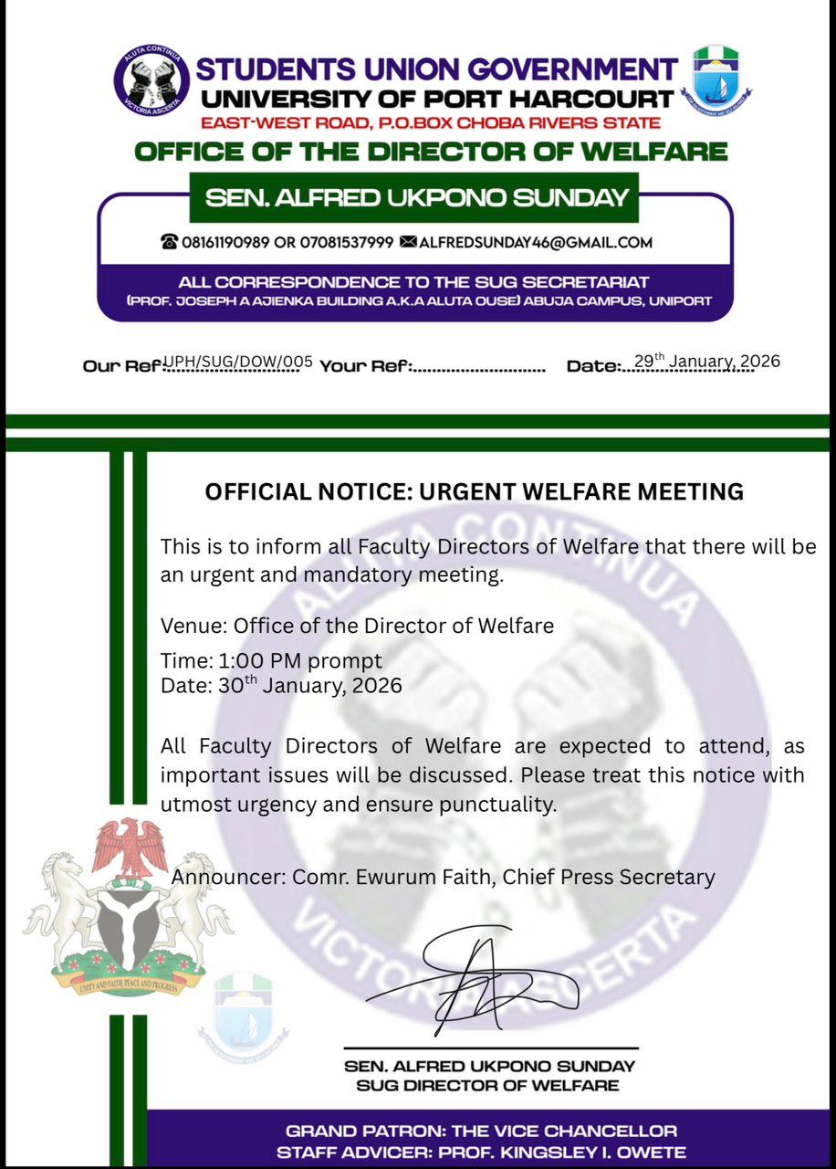 The Office of the Director of Welfare, Students’ Union Government, University of Port Harcourt, has announced an urgent and mandatory welfare meeting for all Faculty Directors of Welfare.