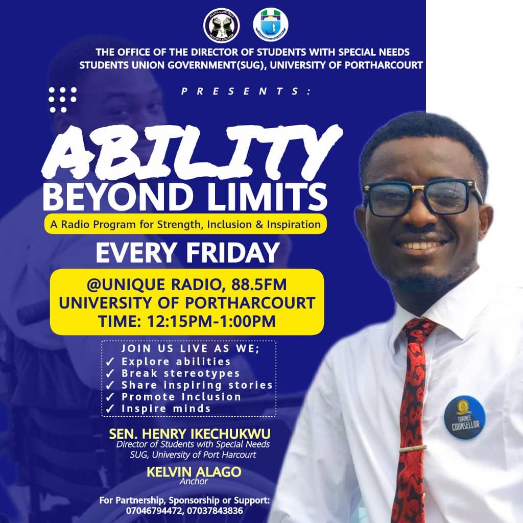 Hello Uniport! 👋 Join us for a life-changing radio experience where voices are heard, stories matter, and stereotypes are broken — brought to you by the Office of the Director of Students with Special Needs, SUG, University of Port Harcourt. 🌟 ABILITY BEYOND LIMITS A radio program for students who want to grow beyond stereotypes, think deeper, and understand the true meaning of INCLUSION — on campus and beyond. 🗓 Every Friday 📻 Unique Radio 88.5FM, UniPort ⏰ 12:15PM – 1:00PM 📢 Tune in. Tell someone. Be part of the movement. #Join us as we build a student community where every voice is heard and every peculiarity embraced. ✍️ SEN. HENRY IKECHUKWU Director of Students with Special Needs, SUG, University of Port Harcourt _____________________________________________ We have a WhatsApp channel. Do well to follow for exclusive offers, placements and real time updates; https://whatsapp.com/channel/0029VbAYOmR05MUbjMcimM00 _____________________________________________ #UniqueStoary #Uniport #Stoary #ABetterUniport #SUGUniport #UniportSUG #Cikamo #Campus #CampusGist #CampusLife #StudentWelfare