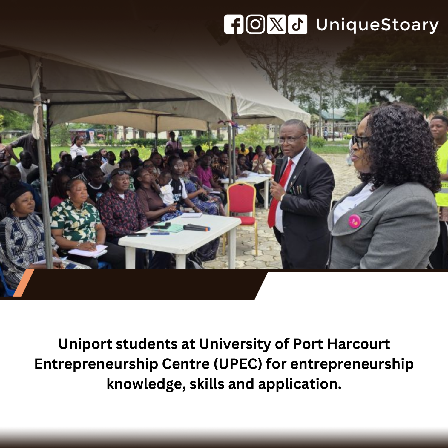 Uniport Students at University of Port Harcourt Entrepreneurship Centre (UPEC) for Entrepreneurship Knowledge, Skills and Application. Students of Uniport were at the College of Continuing Education at the University of Port Harcourt Entrepreneurship Centre (UPEC) for pratical experiences on several entreprenuership endeavours. The Uniport Vice Chancellor Prof. Owunari Georgewill commended the Director of the Centre Dr Elizabeth Okah and her team for their commitment and the students for their resilience. 📌 Join the Unique Stoary Community on Telegram let's have real time discussions on latest happenings and matters arising in Uniport. Click on this link to join https://t.me/uniquestoary _____________________________________________ We have a WhatsApp channel. Do well to follow for exclusive offers, placements and real time updates; https://whatsapp.com/channel/0029VbAYOmR05MUbjMcimM00 _____________________________________________ #UniqueStoary #Uniport #Stoary #Entrepreneurship #ABetterUniport #Campus #CampusGist #CampusLife