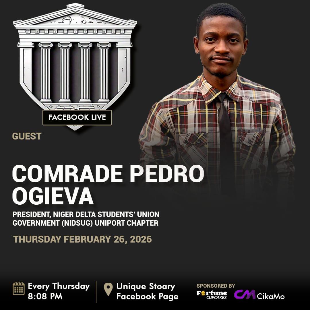 🎙️ #StoaryTime x Comrade Pedro Ogieva President, Niger Delta Students' Union Government (NIDSUG) What does it take to lead one of the most vibrant student bodies on campus, balance the weight of advocacy with academic excellence, and build a voice that resonates across the Niger Delta and beyond? This week on #StoaryTime, we sit down with Comrade Pedro Ogieva, the President of the Niger Delta Students' Union Government (NIDSUG), Uniport Chapter. A dynamic student leader and a dedicated advocate for student welfare, Comrade Pedro has become a pivotal figure in the Uniport landscape. From the frontlines of student governance to the realities of navigating leadership in a complex academic environment, Comrade Pedro Ogieva shares his journey, the challenges of the "Comrade" lifestyle, and the vision that keeps him moving. We also get to discuss and get more details about the free transportation initiative in the University of Port Harcourt. From passion to policy, from activism to impact — this episode promises to be a special in leadership, resilience, and service. ⏰ Thursday, February 26, 2026 | 8:08 PM 📍 Live on Facebook — Unique Stoary _____________________________________________ We have a WhatsApp channel. Do well to follow for exclusive offers, placements and real time updates; https://whatsapp.com/channel/0029VbAYOmR05MUbjMcimM00 _____________________________________________ #UniqueStoary #Uniport #Stoary #ABetterUniport #StoaryTime #NIDSUG #NigerDeltaStudents #StudentLeadership #Cikamo #Campus #CampusGist #CampusLife #CampusUpdate #ProudlyUniport #Leadership #Advocacy #Politics
