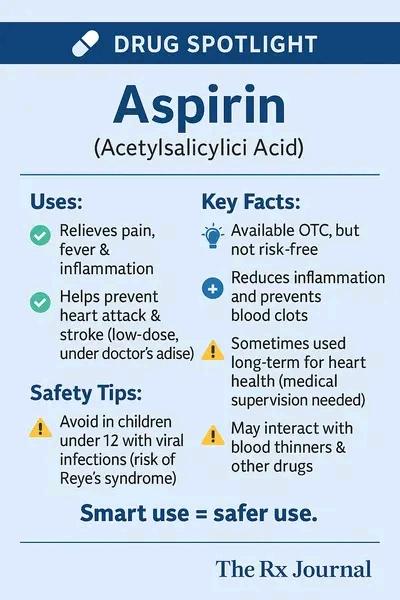 💊 Drug Spotlight – Aspirin (Acetylsalicylic Acid) Use: ✅ Relieves pain, fever, and inflammation ✅ Low-dose helps prevent heart attack & stroke (doctor’s advice) Key Facts: Available OTC in many countries, but not risk-free Works by reducing inflammation and preventing blood clots Often used in long-term therapy for certain heart conditions (only under medical supervision) Safety Tips: ⚠️ Avoid in children under 12 with viral infections (risk of Reye’s syndrome) ⚠️ Can cause stomach irritation & increase bleeding risk ⚠️ Use with caution if you have ulcers, asthma, or bleeding disorders ⚠️ May interact with blood thinners & certain other medicines Smart use = safer use. — The Rx Journal 🤚