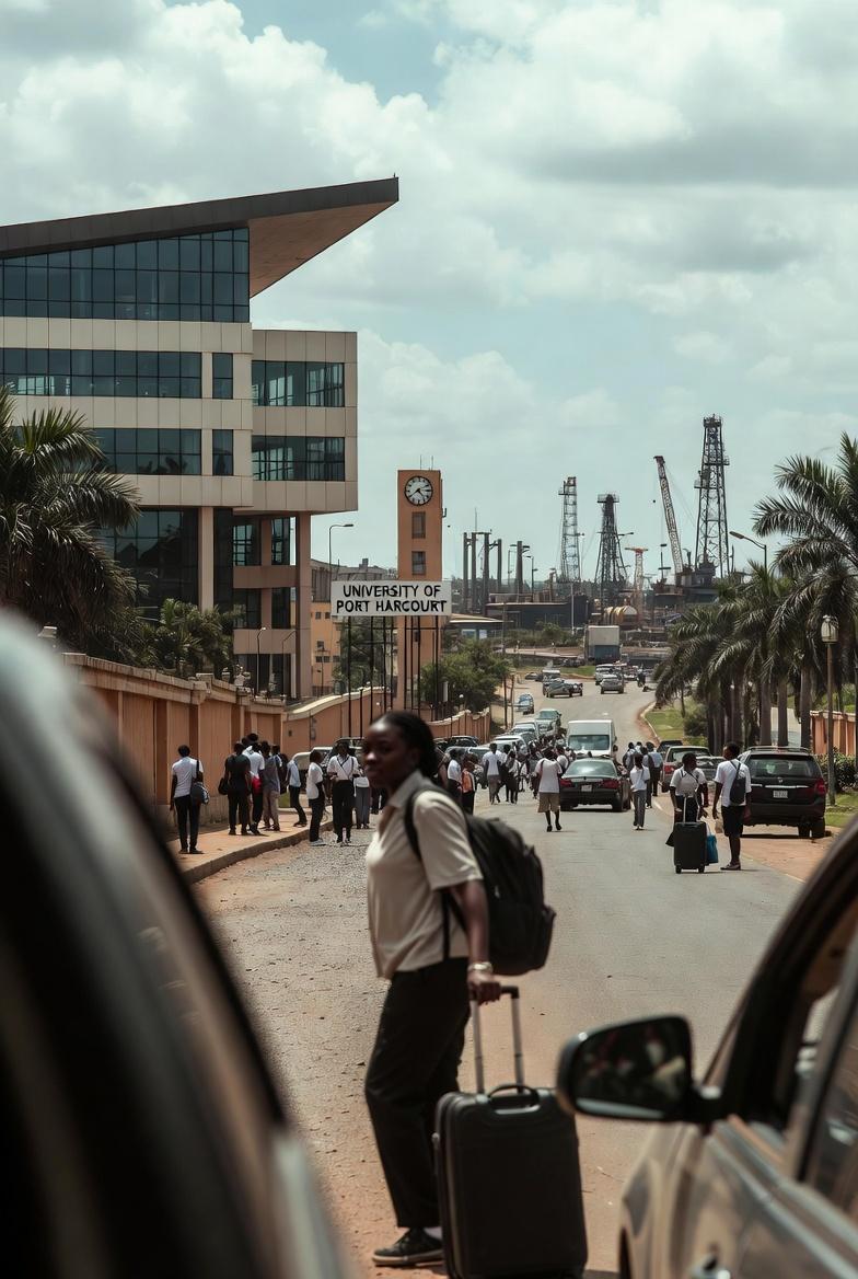 Ada's alarm blared at 6 AM, jolting her awake in the humid Uniport hostel. She rushed to her first lecture in the Faculty of Engineering building, a sprawling structure amid palm trees. The lecturer, Prof. Okoro, dove straight into thermodynamics, his chalk flying across the board. Ada scribbled notes furiously, her mind racing to keep up. Chidi, studying computer science, joined her for lunch at the popular Mama Cass eatery, where they devoured jollof rice and discussed the overwhelming syllabus. "Uniport isn't for the faint-hearted," Chidi warned. In the afternoon, Ada attended a chemistry lab, donning a white coat and mixing compounds under the watchful eye of the lab technician. A minor spill taught her the importance of caution. Back in the hostel, study groups formed spontaneously—friends like Fatima from Kano and Emeka from Enugu shared tips on time management. Ada realized success required more than brains; it needed strategy. She created a study timetable, vowing to balance academics with rest. As stars twinkled over the Delta Park, she felt the first pangs of homesickness but pushed forward, inspired by the campus motto: "For Enlightenment and Self-Reliance."